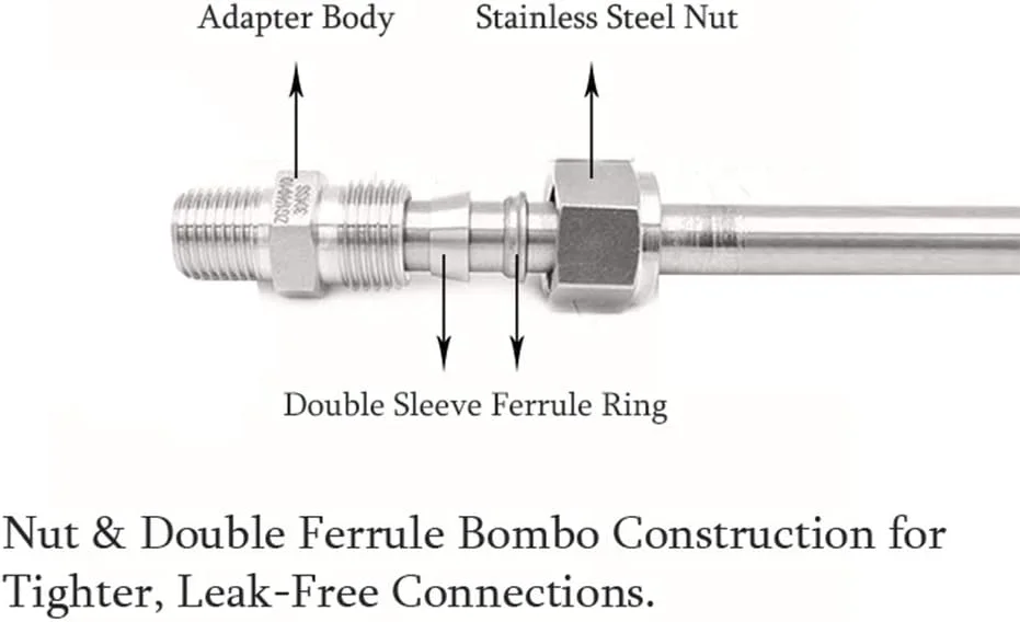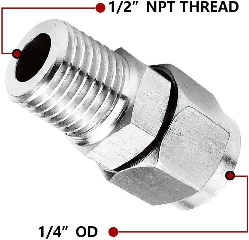 This Beduan 304 stainless steel compression fitting gave me a solid, leak free connection on my 1/4 inch tubing to 1/2 inch NPT setup