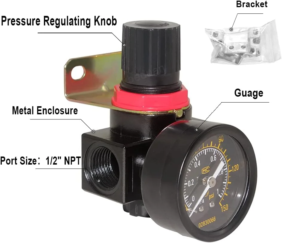 The Beduan BR4000 Air Compressor Regulator Combo 1/2" NPT is designed to deliver reliable, consistent air pressure control for a wide range of pneumatic applications. Built for both performance and durability, this unit combines an air filter, regulator, and lubricator in one compact assembly, helping you protect your tools and optimize system efficiency. With a 1/2" NPT female inlet size, the BR4000 integrates easily into standard compressed air systems. Its operating pressure range of 0–145 psi gives you precise control over the output pressure, making it suitable for everything from light-duty shop tools to more demanding industrial equipment. The unit is engineered for a maximum working pressure of 160 psi, providing a robust safety margin and dependable operation under typical shop and factory conditions. The integrated pressure gauge offers clear, at-a-glance readings, allowing you to quickly set and monitor your desired pressure. A manual drain makes it easy to remove accumulated moisture and contaminants from the filter bowl, helping to extend the life of your air tools and maintain consistent air quality. The included mounting bracket simplifies installation, enabling secure placement on walls, frames, or equipment panels for a clean and organized setup. Manufactured with quality materials and careful attention to detail, the Beduan BR4000 is built to withstand daily use while maintaining stable performance. It is an excellent choice for workshops, garages, small manufacturing lines, and any environment where controlled, clean compressed air is essential. By combining regulation, filtration, and convenient manual draining in a single unit, the BR4000 helps reduce maintenance time, improve tool longevity, and enhance overall system reliability. Choose the Beduan BR4000 Air Compressor Regulator Combo for a dependable, easy-to-install solution to your compressed air management needs.
