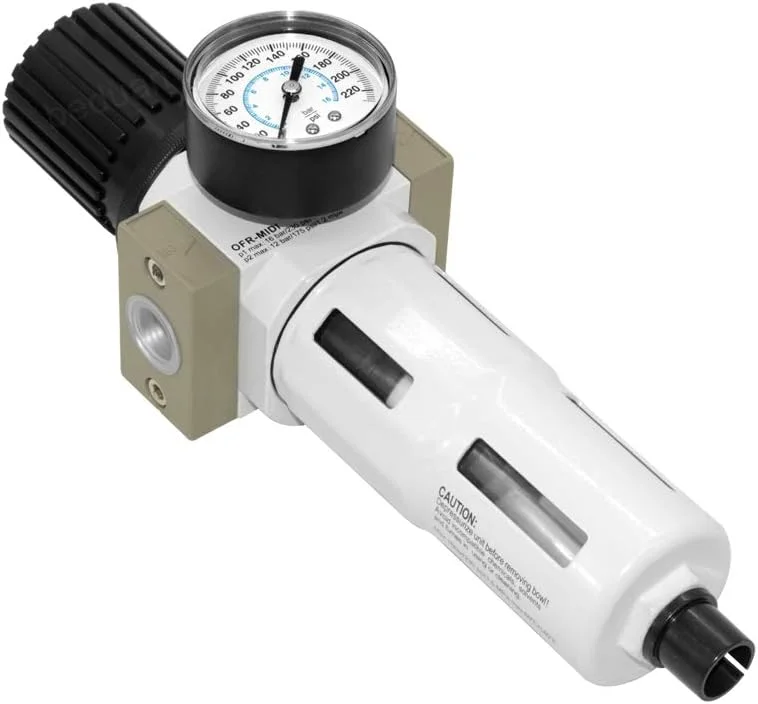 The Beduan Compressed Air Pressure Regulator Filter 1/2" NPT is designed to deliver clean, dry, and stable air to your pneumatic tools and systems. Built for reliability and efficiency, this water/oil trap separator combo is ideal for workshops, manufacturing environments, and any application where consistent air quality and pressure control are essential. Featuring a 1/2" NPT port size, this MIDI series unit integrates easily into standard compressed air lines. With a maximum working pressure of 230 psi, it supports a wide range of industrial and professional air systems, providing dependable performance even under demanding conditions. The integrated pressure regulator allows you to precisely adjust and maintain the desired outlet pressure, helping protect your tools, extend equipment life, and improve overall system performance. The built-in filter and separator efficiently remove water, oil mist, and other contaminants from the air stream before it reaches your equipment. This helps prevent corrosion, premature wear, and inconsistent tool operation. The filter cup has a capacity of 1.45 ounces (43 cc), providing ample volume for effective moisture and contaminant collection while keeping the unit compact and easy to install in tight spaces. Engineered for durability, the Beduan regulator filter is constructed from quality materials to ensure long-term, stable operation with minimal maintenance. Its clear bowl design (if applicable) allows for quick visual inspection of collected water and oil, so you know at a glance when it’s time to drain. Simple adjustment controls and straightforward installation make it suitable for both new systems and retrofits. Choose the Beduan Compressed Air Pressure Regulator Filter 1/2" NPT to improve air quality, protect your pneumatic investments, and achieve consistent, reliable performance from your compressor-driven tools and equipment.