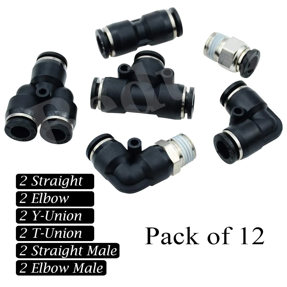 The variety in this 12 piece set is ideal, I did not have to buy extra fittings because the straight, elbow, tee and Y pieces covered every connection
