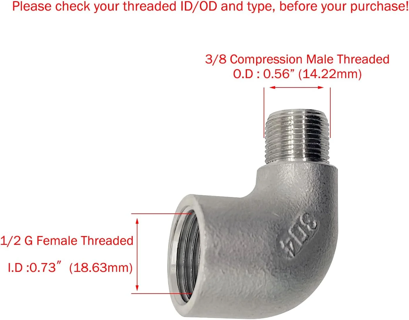 The Beduan Stainless Steel Water Line Adapter is a reliable and durable solution for connecting 3/8 compression water lines to 1/2 angle stop valves in residential and commercial plumbing systems. Designed as a 90 degree elbow reducer, this fitting is ideal for tight spaces where a straight connection is not practical, helping you route water lines neatly and efficiently behind cabinets, sinks, and appliances. This adapter features a 3/8 compression male end with an outside diameter of 0.56 inch (14.22 mm), specifically engineered for standard 3/8 compression connections. Please note that it is not compatible with 0.61 inch lines. On the other side, the 1/2 G female threaded end has an inside diameter of 0.73 inch (18.63 mm), allowing it to connect securely to 1/2 BSP angle stop valves and fittings. The 1/2 G female threads do not have a flat sealing surface inside and are designed to be sealed using Teflon tape for a leak-free joint. Manufactured from high quality stainless steel, this adapter offers excellent corrosion resistance, long service life, and a clean, professional appearance. It is suitable for use in potable water lines, home supply hoses, stop valves, and general pipe connections where a 3/8 to 1/2 transition is required. The robust construction ensures stable performance under typical household water pressures. Each pack includes two adapters, providing added value and convenience for multi-point installations or future replacements. Whether you are a professional plumber or a homeowner working on a DIY project, this Beduan stainless steel water line adapter delivers a precise fit, dependable sealing, and easy installation. Choose this 90 degree elbow reducer to simplify your plumbing connections and ensure a secure, efficient transition between 3/8 compression lines and 1/2 angle stop valves.